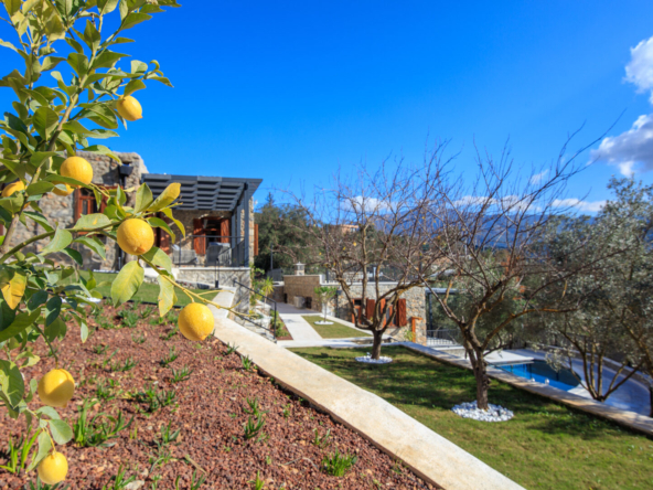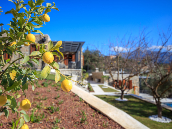 The estate comprises two detached stone houses, each of a single-storey design, positioned harmoniously around terraced grounds with a shared pool and outdoor living spaces.