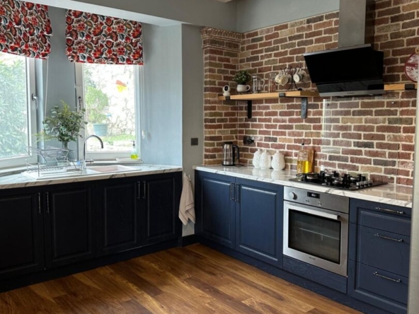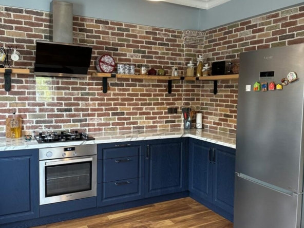 To the rear, there’s a fully renovated kitchen with elegant white marble worktops and modern appliances, including an electric oven, gas hob, extractor hood, and a large American-style fridge-freezer.