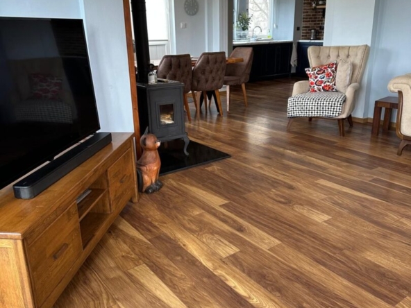The main living area is open-plan, with a spacious lounge featuring a curved bay-style window and patio doors. An indoor dining area comfortably seats six, ideal for family meals and entertaining, while a wood-burning stove sits centrally as a practical focal point.