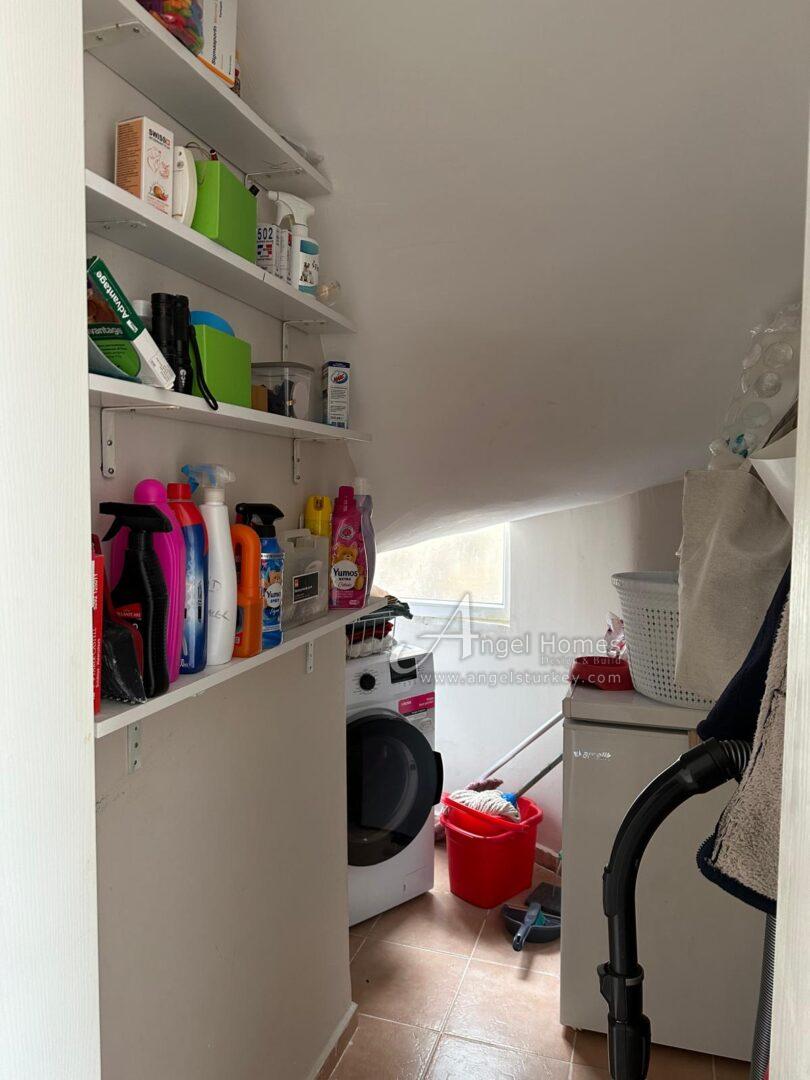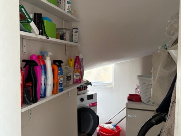 The entrance opens into a long hallway with a WC off to one side and an under-stairs utility cupboard with a washing machine and storage.