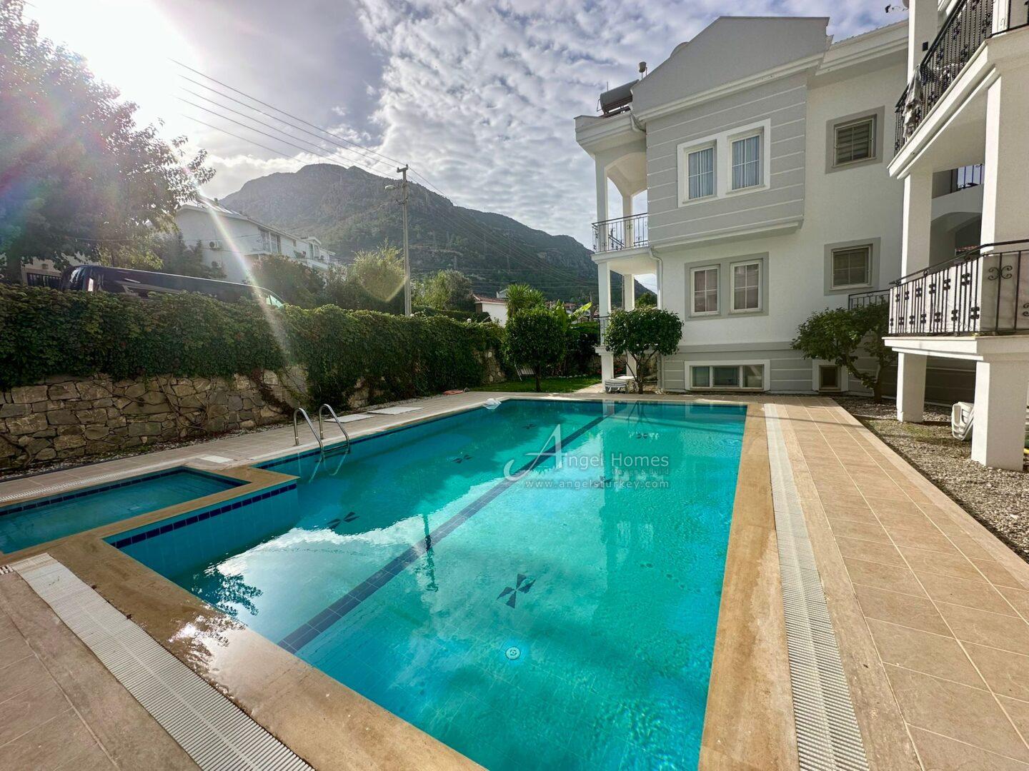 Listed exclusively with Angel Homes, this renovated 3-bed reverse duplex in Hisaronu is a fantastic option if you are looking for a spacious, key-ready property within easy reach of the shops, bars, and amenities in the resort centre. It’s located on a quiet residential street, yet just a short walk from restaurants, shops, and transport links to Oludeniz Beach, Fethiye, and Kayakoy. The apartment is spread over the bottom two floors of a low-rise block on a small site with a shared pool and children’s pool. The interior has been thoughtfully redesigned to create a larger open-plan living space with a kitchen, bathroom, and balcony on the entrance floor and three bedrooms sharing the second bathroom on the lower level. Offered fully furnished, this apartment is ideal as a holiday home or base in the area.