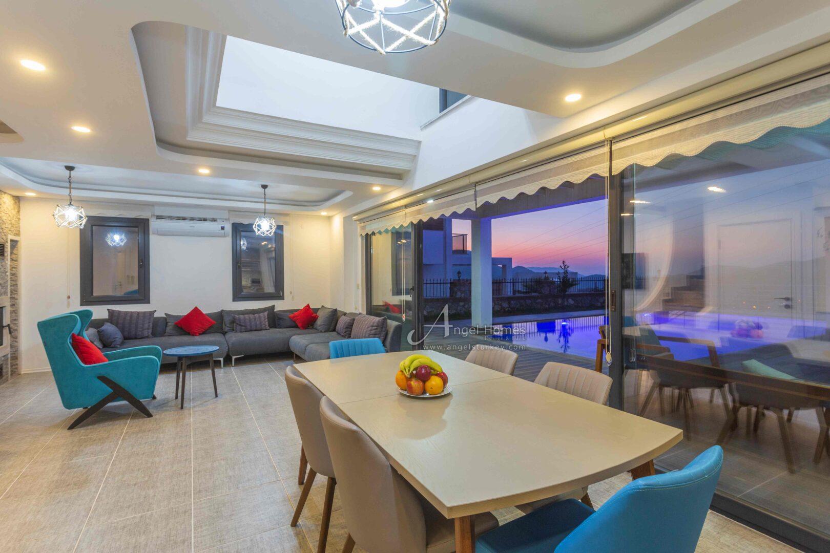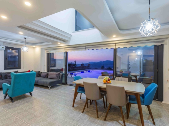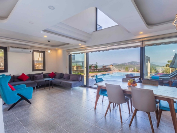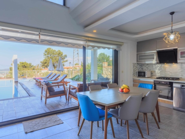Large patio doors lead directly onto the poolside dining terrace, creating a natural extension of the living space during the summer months.
