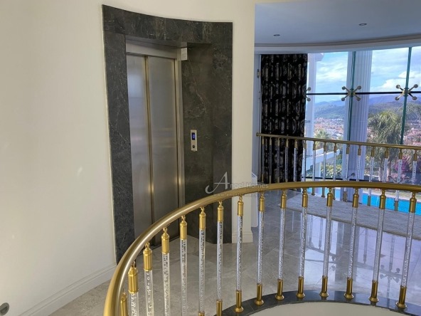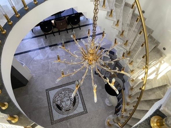 The impressive entrance offers an enclosed porch area for shoes and outside wear, leading to the main steel enforced front door with smart system security system and fingerprint key lock. The grand large hallway features a smart system with CCTV that links to smart phones and you will find smart systems throughout this villa. Leading from the hallway is an impressive circular staircase encased with gold coloured fittings and glass, also a lift that follows through to all 4 floors of this villa. The hallway seats a formal dining area which leads to the large kitchen. The kitchen offers plenty of space for entertaining and also has a dining table with chairs, complete with luxury fitted cupboards and all white goods. The large double balcony doors lead out to a large terrace area ideal for al fresco dining.