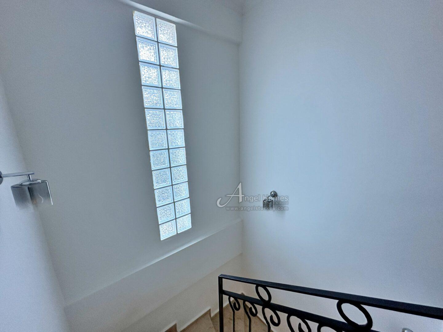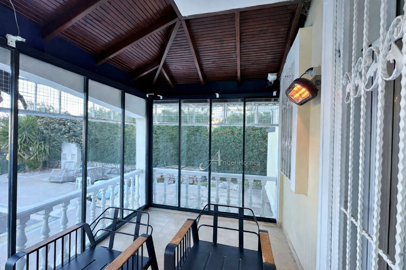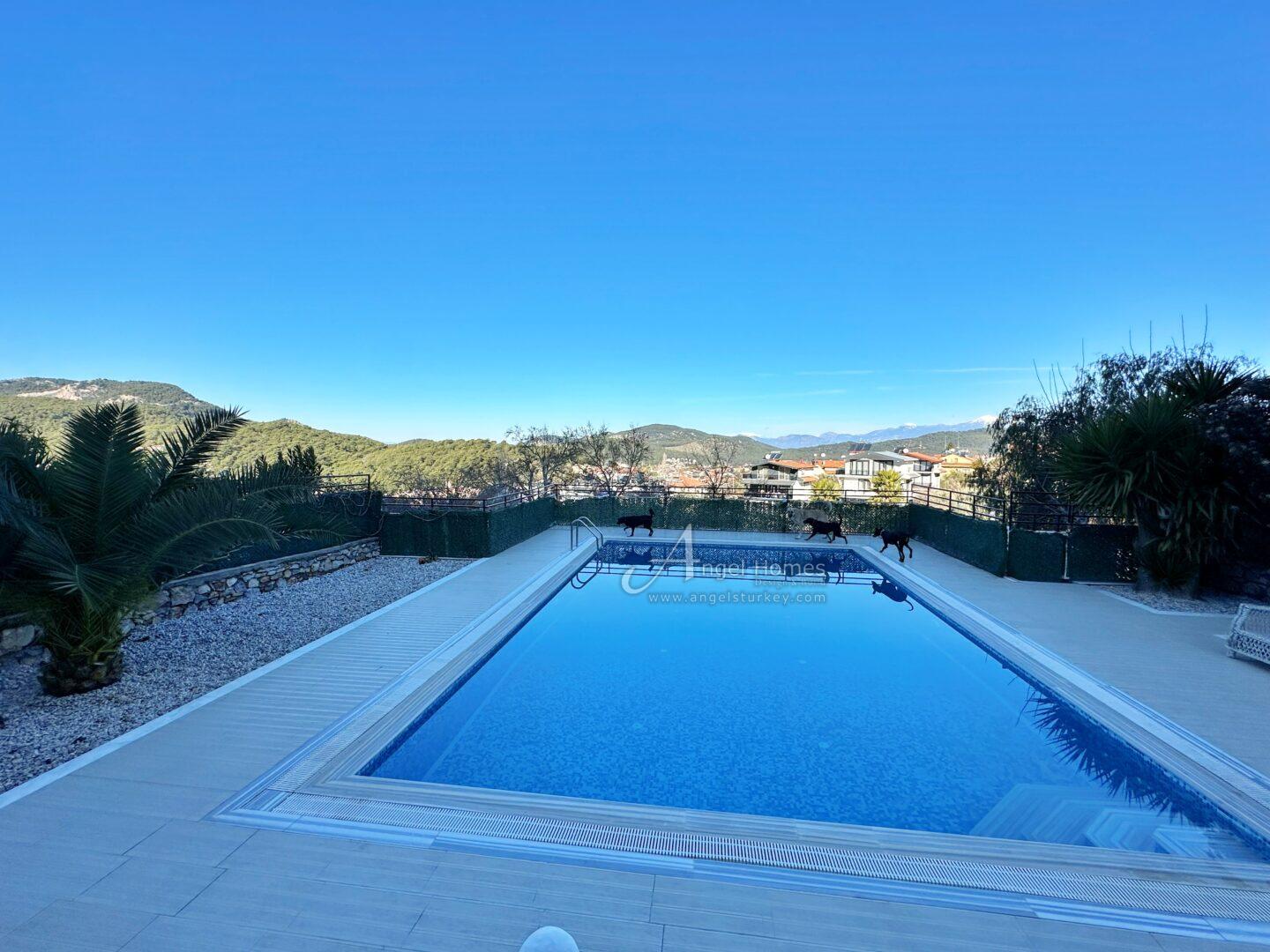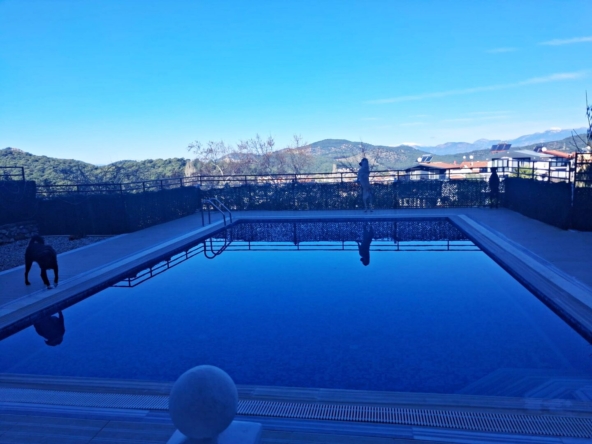 Outside, the villa features a large private swimming pool set within a landscaped garden, offering both sun and shaded areas. The plot provides a good sense of privacy and space, making it ideal for outdoor dining, relaxing, or entertaining against a natural mountain backdrop.