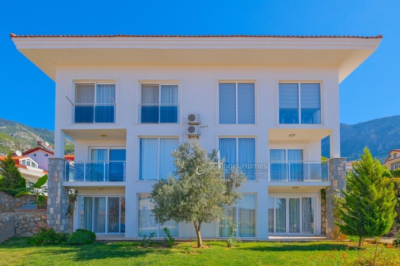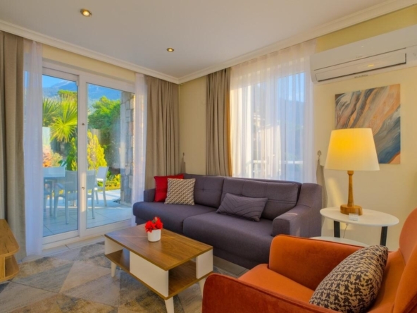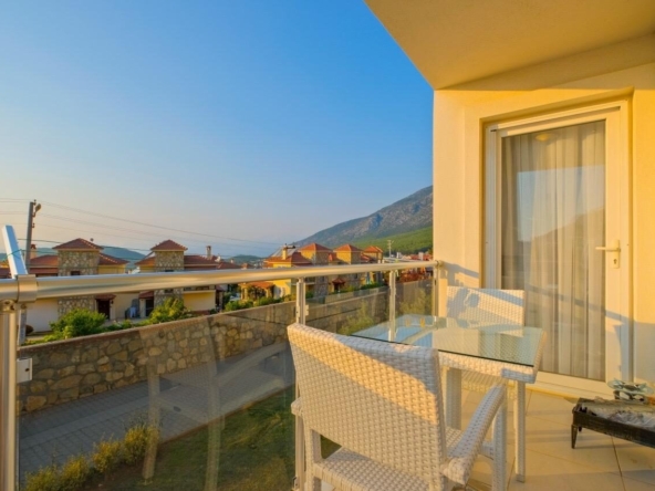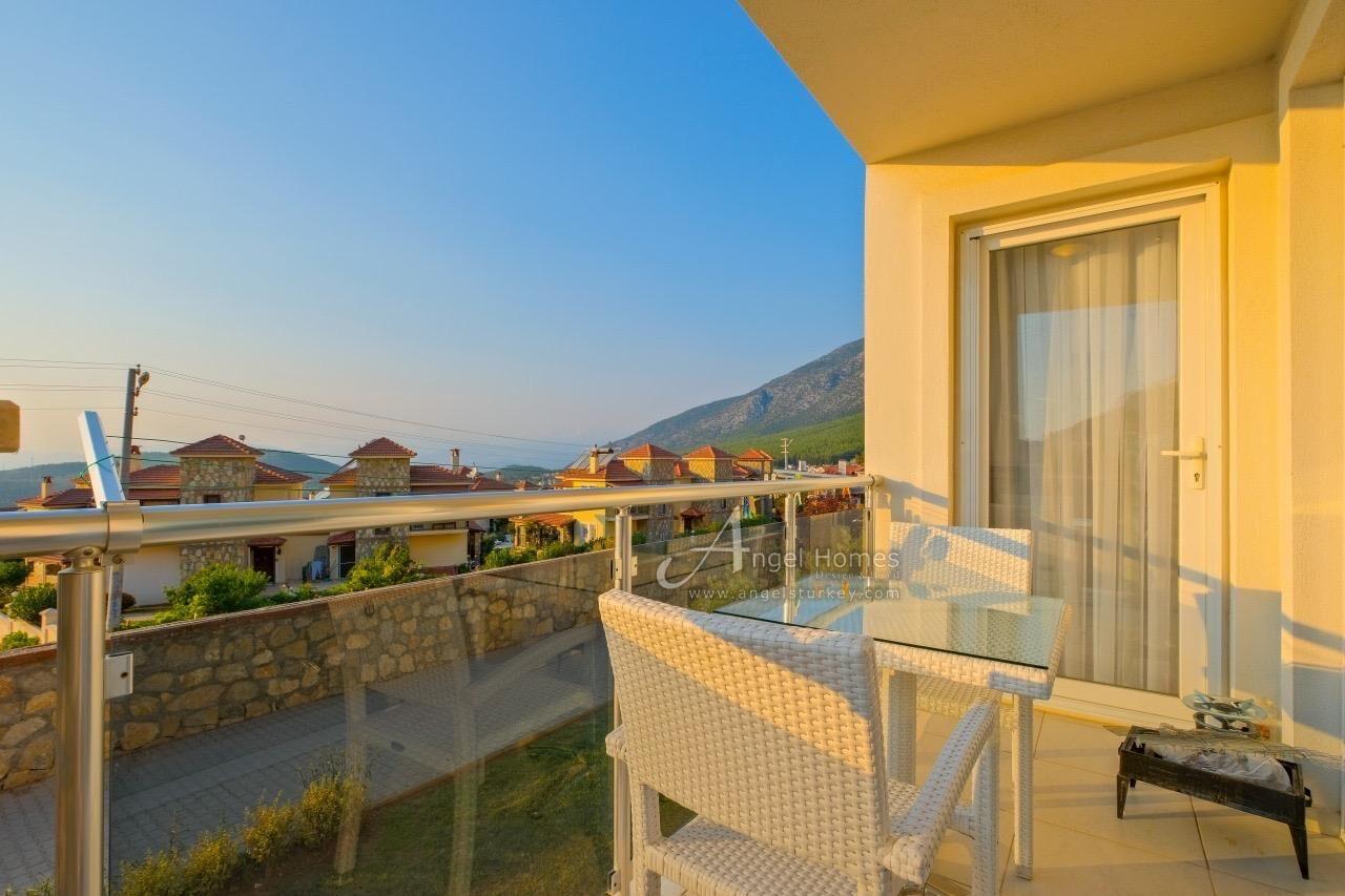 To the rear, a balcony offers panoramic views over the valley, while to the front, the living area opens onto a large L-shaped terrace overlooking the swimming pool and Babadağ mountain.