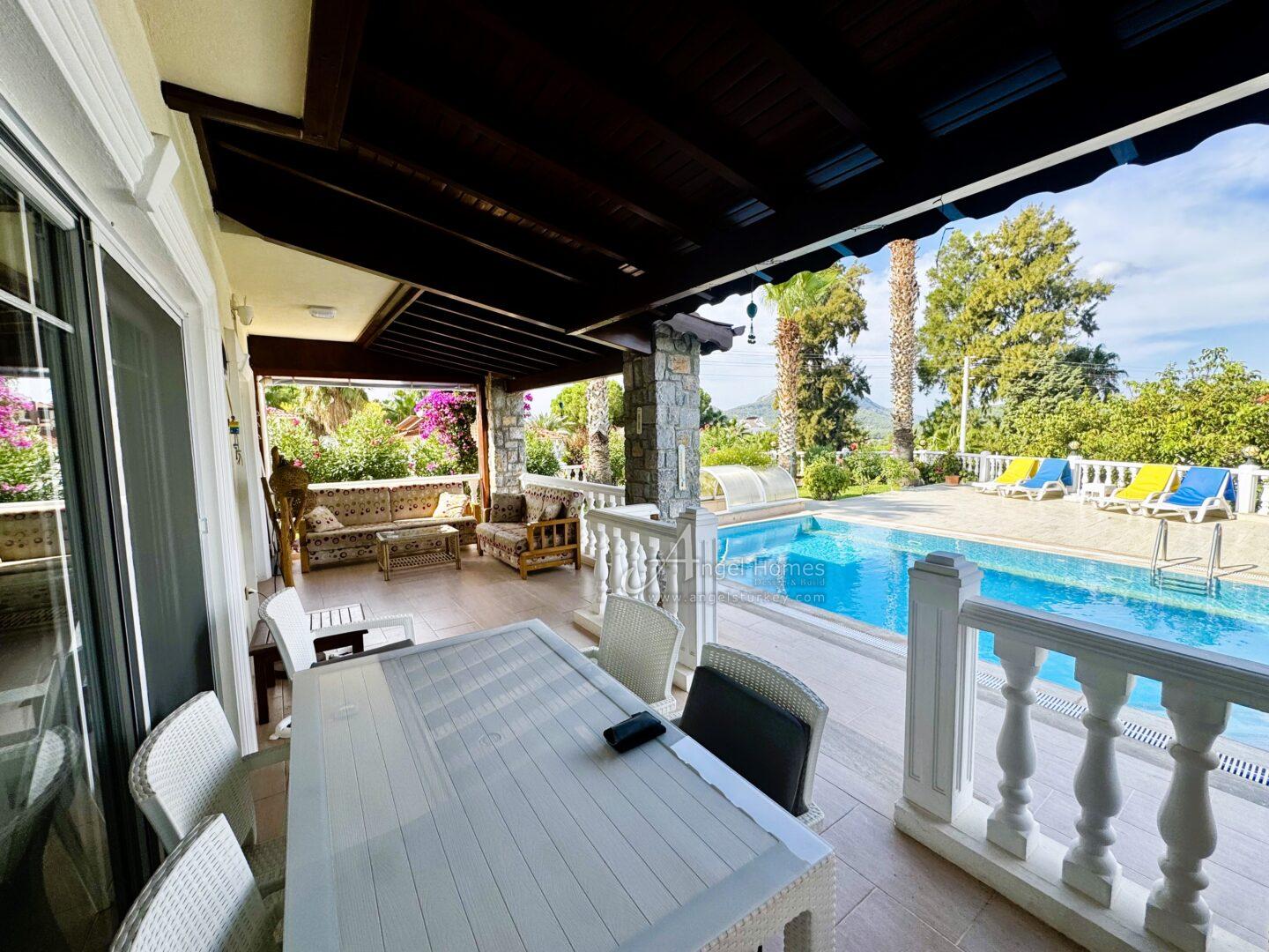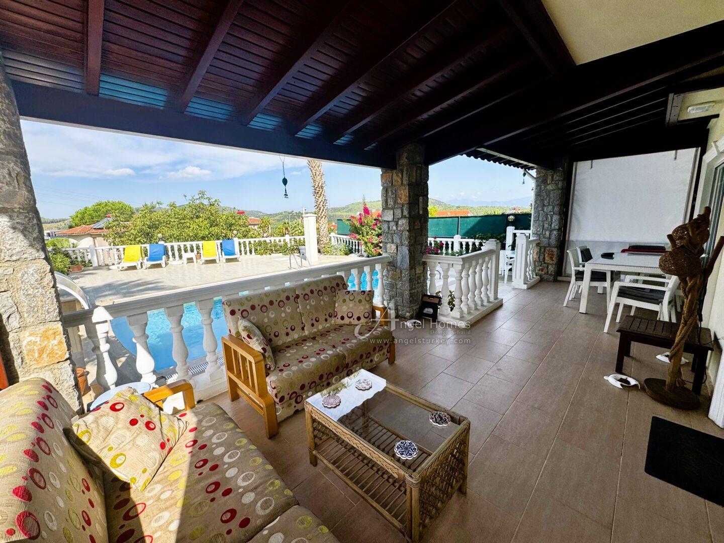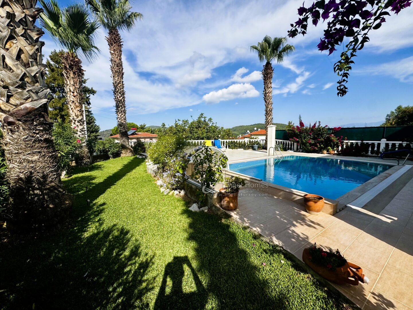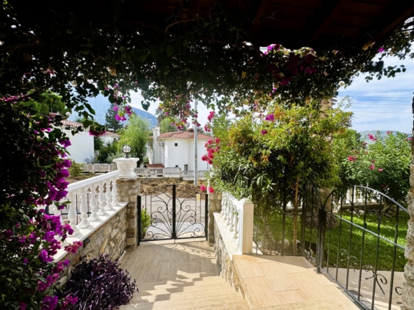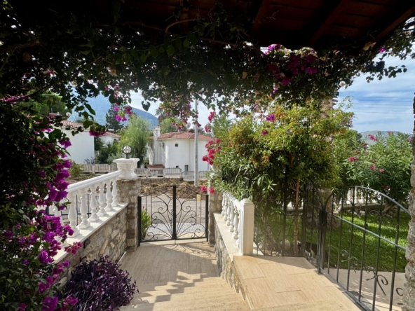 Exterior: This key-ready 2-bed villa in Ovacik sits on a 500m2 plot within a walled garden, with a spacious pool and terrace area ideal for outdoor living. Steps lead down to a large underground garage, which can also be accessed from the roadside (car access door currently requires repair).