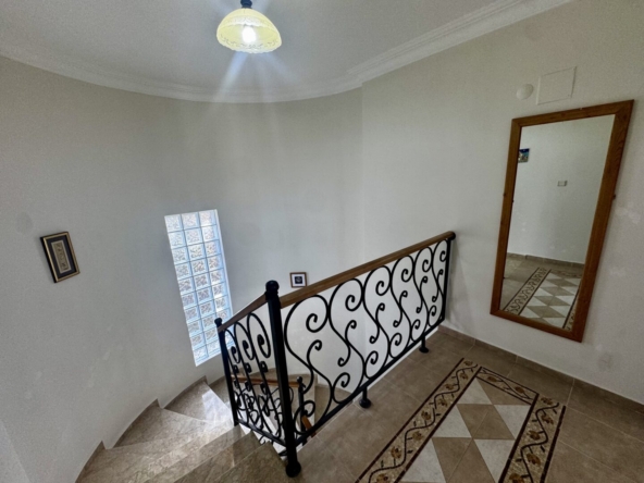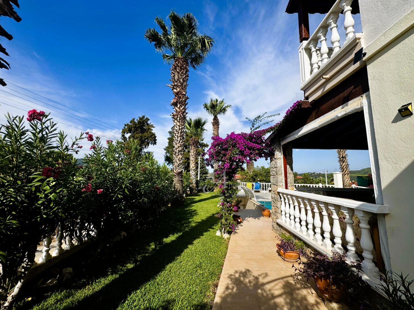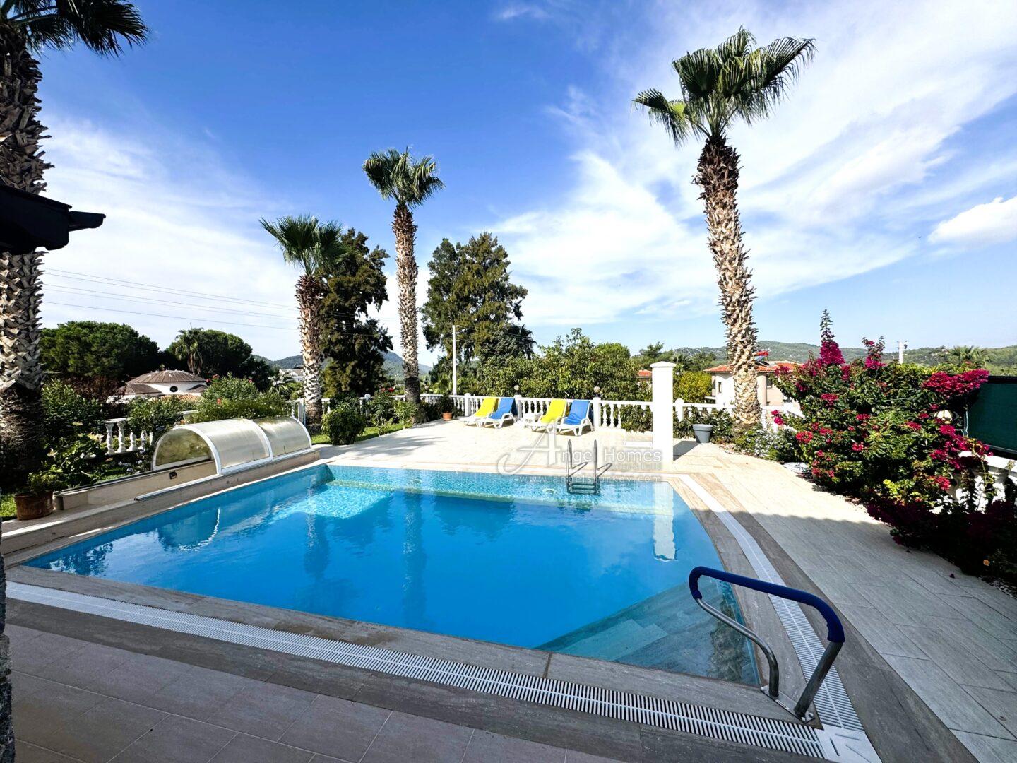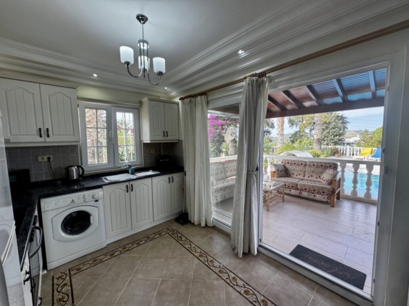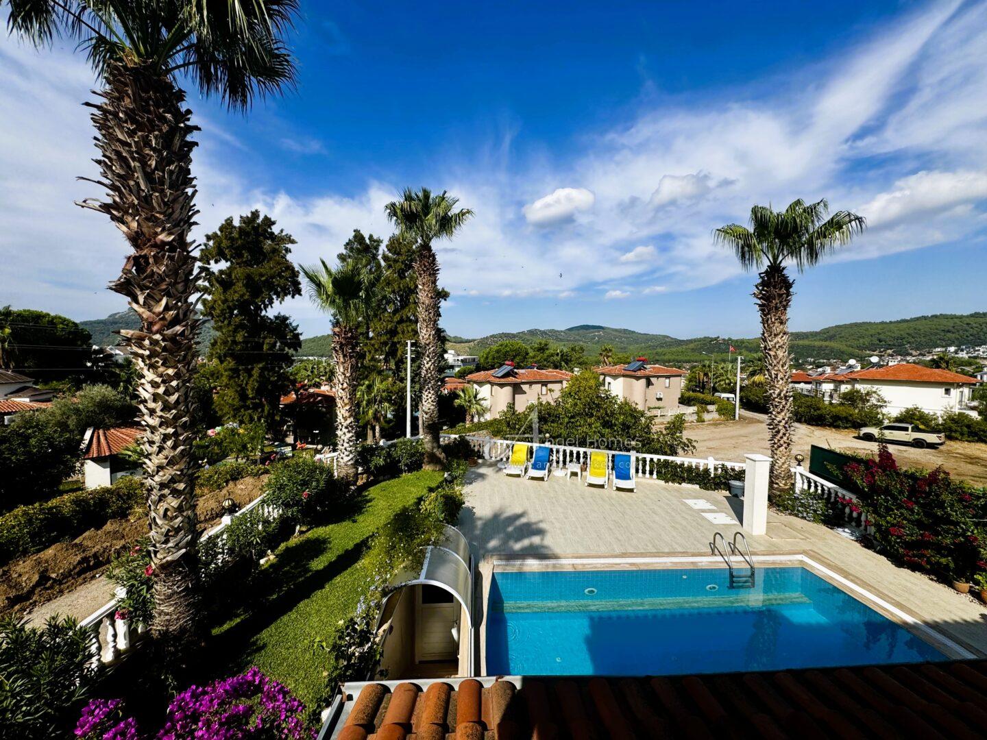 Exterior: This key-ready 2-bed villa in Ovacik sits on a 500m2 plot within a walled garden, with a spacious pool and terrace area ideal for outdoor living. Steps lead down to a large underground garage, which can also be accessed from the roadside (car access door currently requires repair).