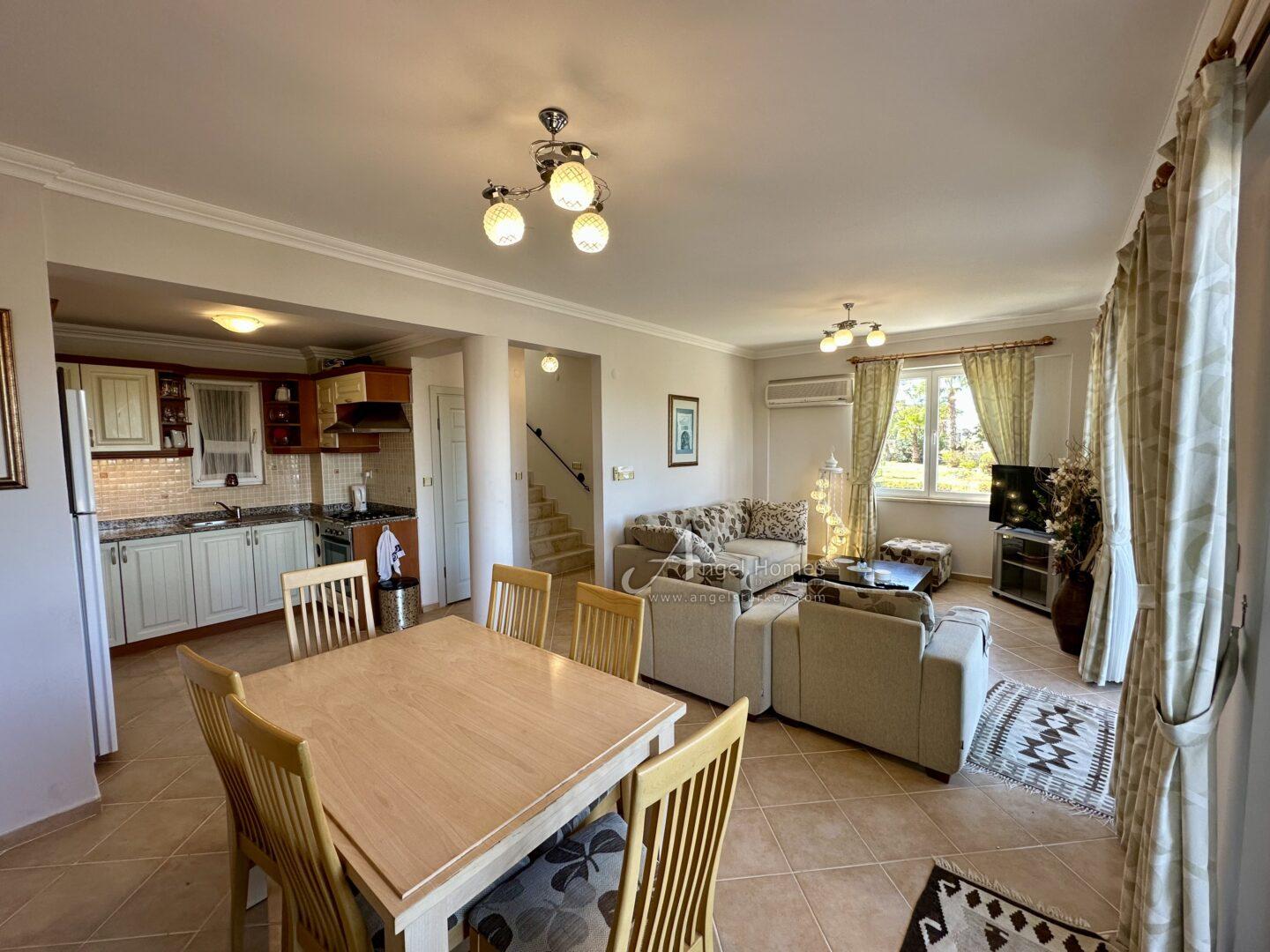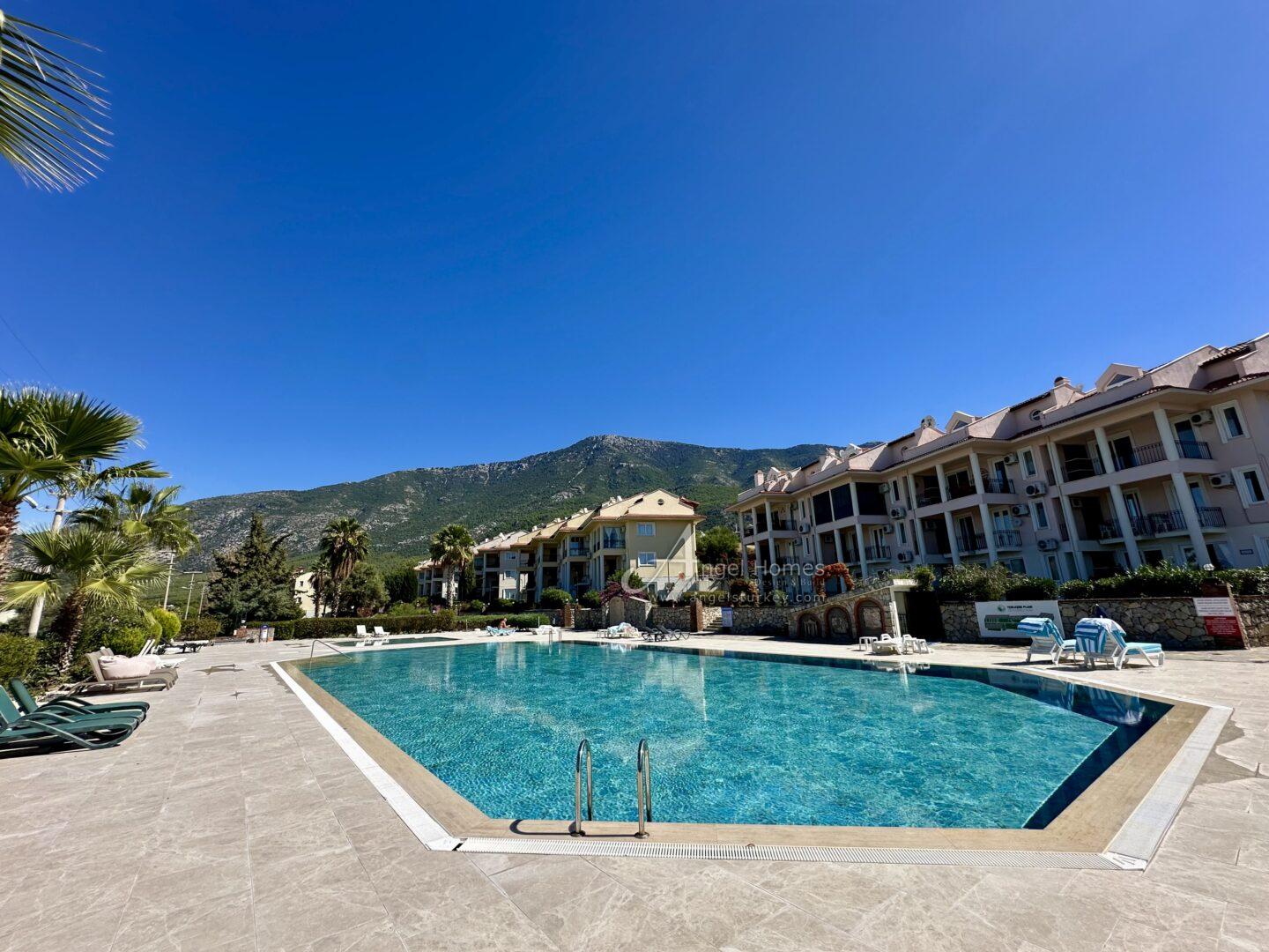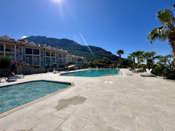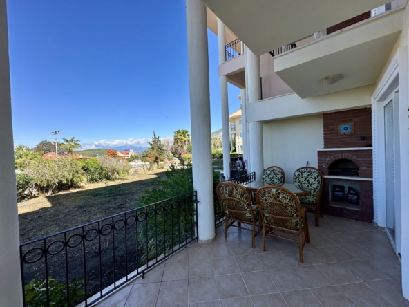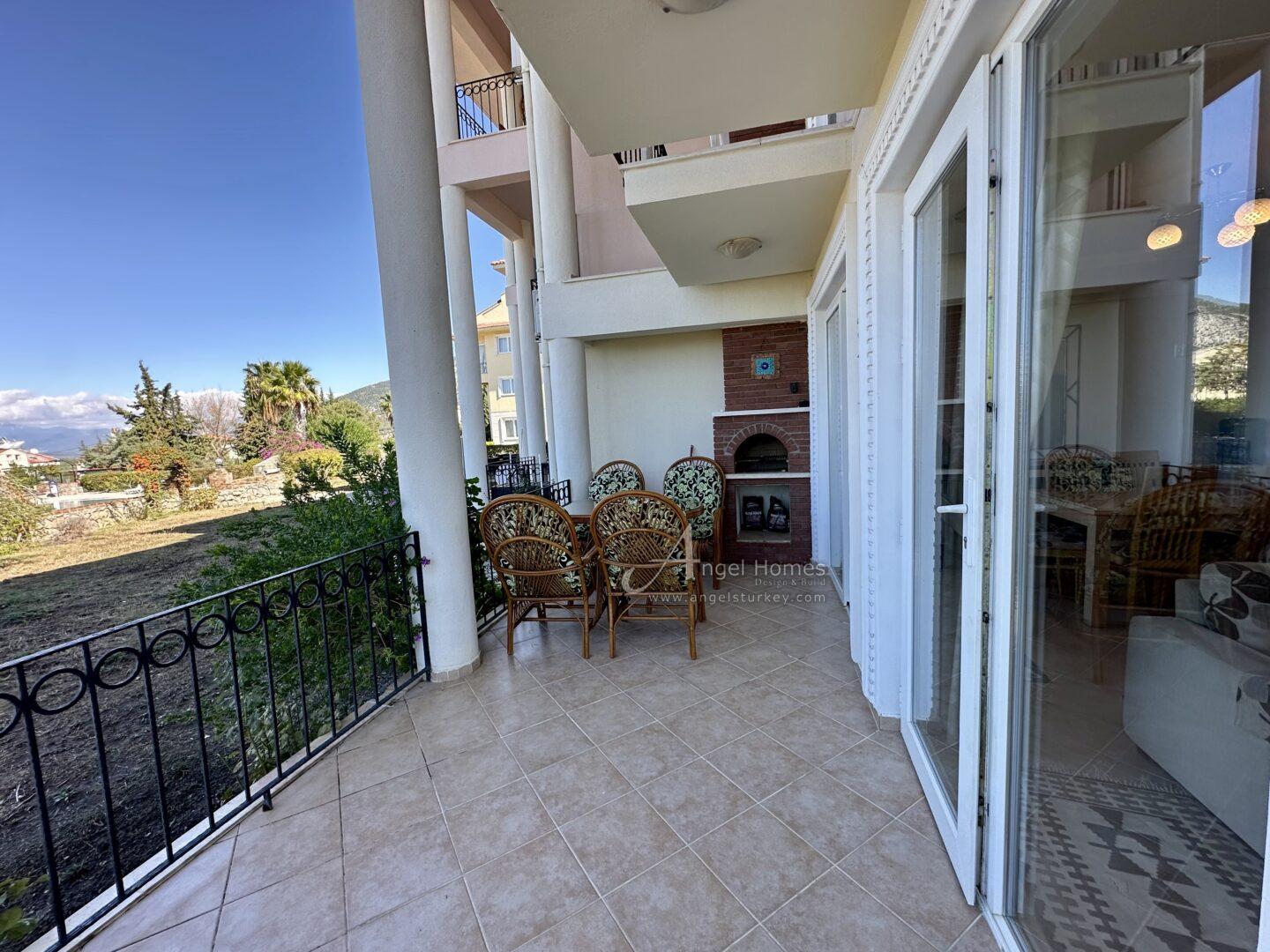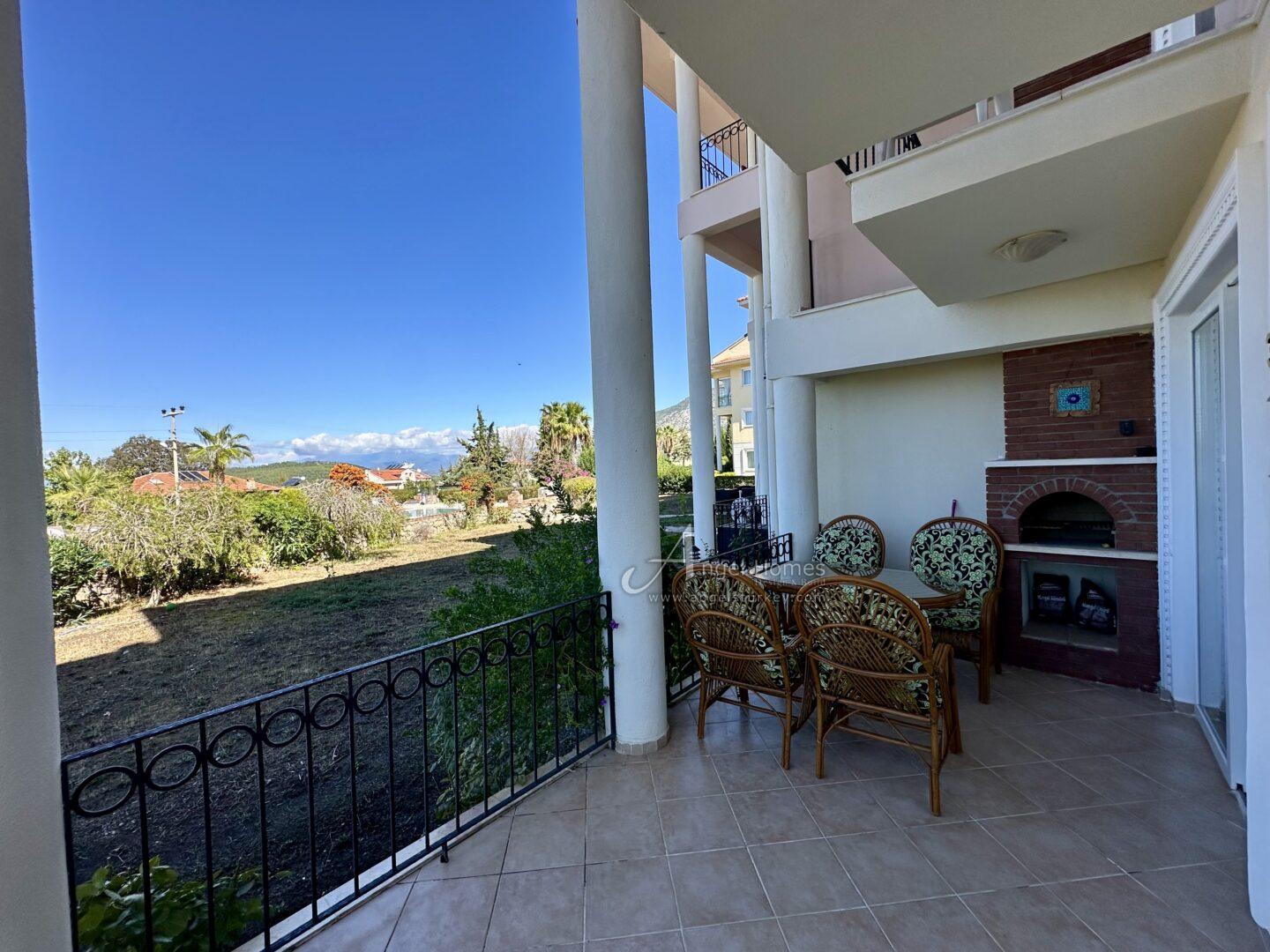 This stylishly furnished 2-bedroom lower duplex apartment for sale in Ovacik is situated in the peaceful Upper Valley, a sought-after area just a 10-minute walk from the restaurants and amenities in Hisaronu, and a 10-minute bus ride from Ölüdeniz Beach and Lagoon. Listed exclusively with Angel Homes, this property is situated in a well-established, gated complex featuring a large shared pool, a children’s pool, and an on-site café/bar. With direct access to the gardens from a spacious dining terrace featuring a built-in BBQ, this well-maintained, key-ready property is ideal for those who love outdoor living – it’s also offered at an excellent price, so contact us today to arrange a viewing.