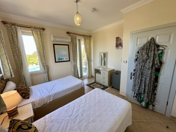 Upstairs are two generous bedrooms, a double and a twin, and a shared bathroom. The twin bedroom opens onto a balcony with pool views, while the double bedroom also has its own private balcony, offering stunning views over the valley and communal pool and grounds.