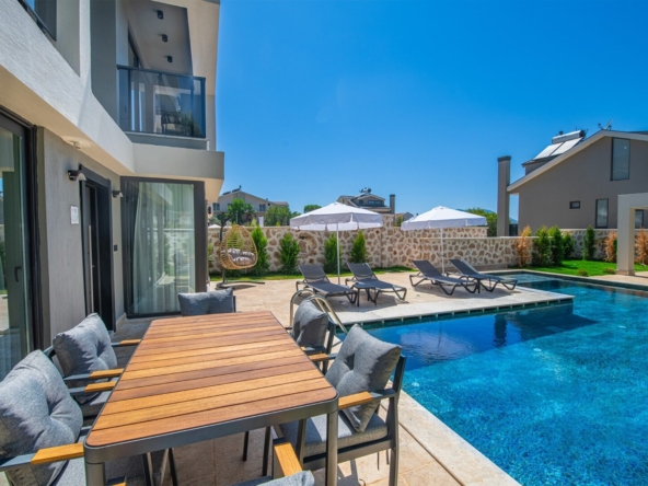 Ground Floor: The main living space is on the ground floor. The living room has ample space for seating and opens onto the poolside terrace via sliding doors. There’s a modern and well-equipped kitchen with a dining area and guest WC.