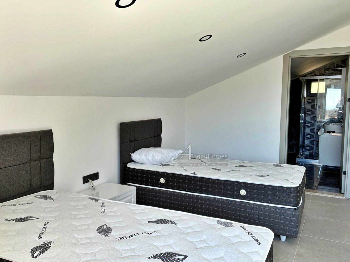 This level features two large bedrooms, each with an en-suite bathroom and access to a balcony with sea views. One of the bedrooms includes a bathtub.