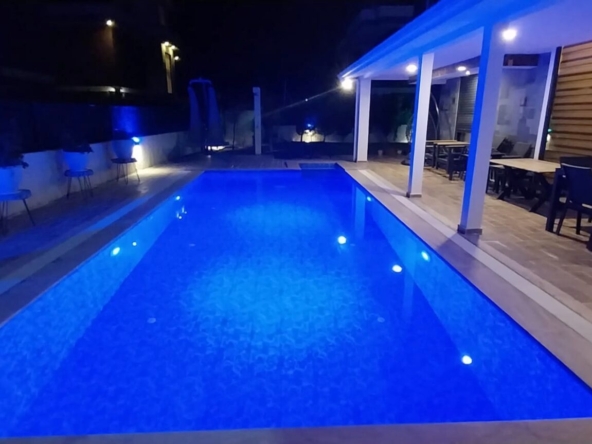 Patio doors lead directly onto the poolside terrace, creating a bright, open feel and ideal space for entertaining.
