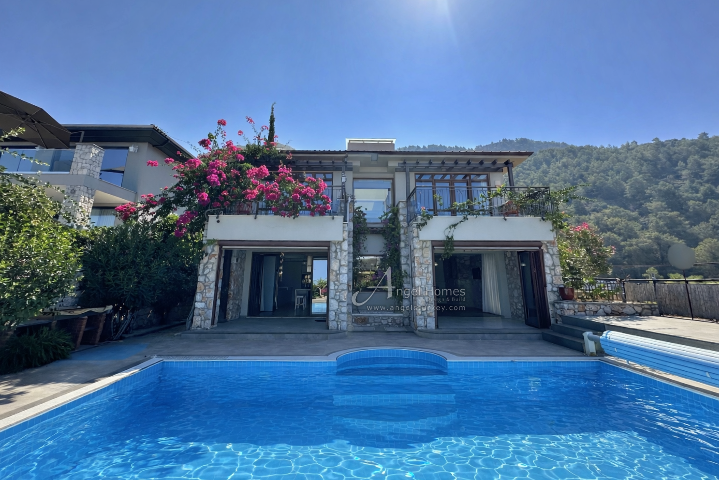 Set in a stunning elevated position, just a 30-minute drive along the coastal road from Oludeniz Beach is this beautiful, part-stone 4-bed sea view villa for sale in Faralya. This large property is tucked into the foothills of Babadag Mountain, boasting generous living spaces, a beautiful private heated pool for year-round swimming, a carport, and extensive grounds. The interior has been tastefully designed with many luxurious and unique features, making it ideal as a family holiday home or retreat, or an excellent investment in an area known for its boutique villas, hotels, and high-end getaways.